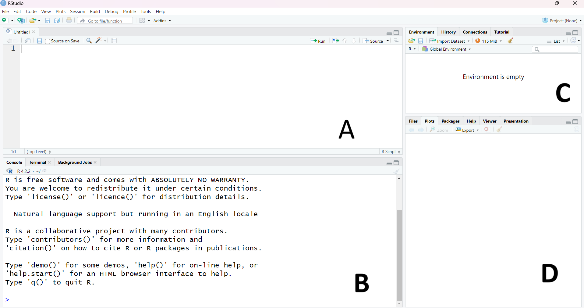 The screenshot below shows the RStudio interface which comprises of four windows: