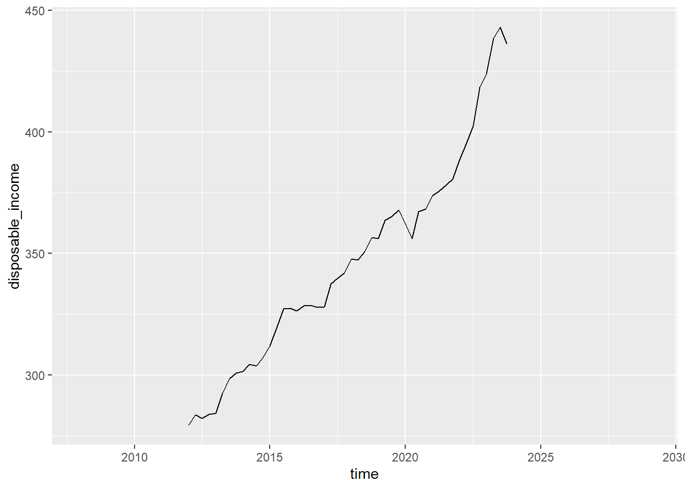 obr_data %>%mutate(time = year + ((quarter -1) * .25)) %>%ggplot() +geom_line(aes(x = time, y = disposable_income))